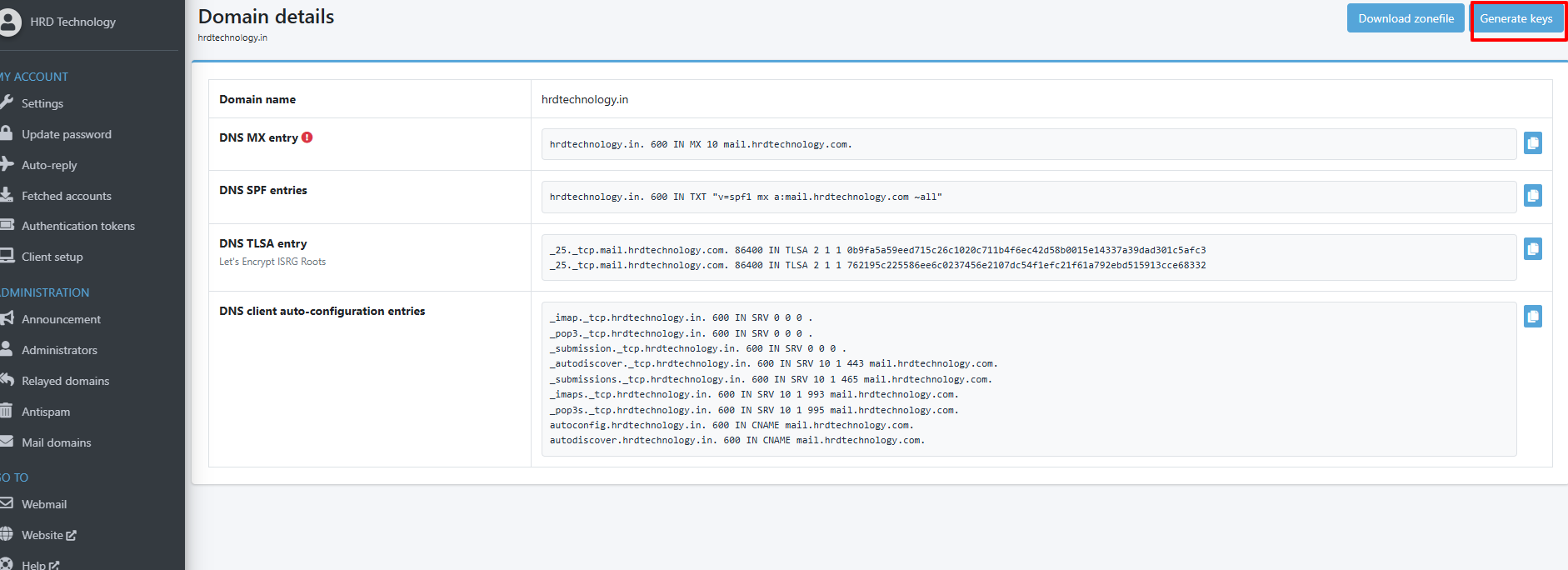Once you click on that it will show the dns record page like bellow, generate the generate keys button to generate the dkim key (it will prevent mail to goes in span)