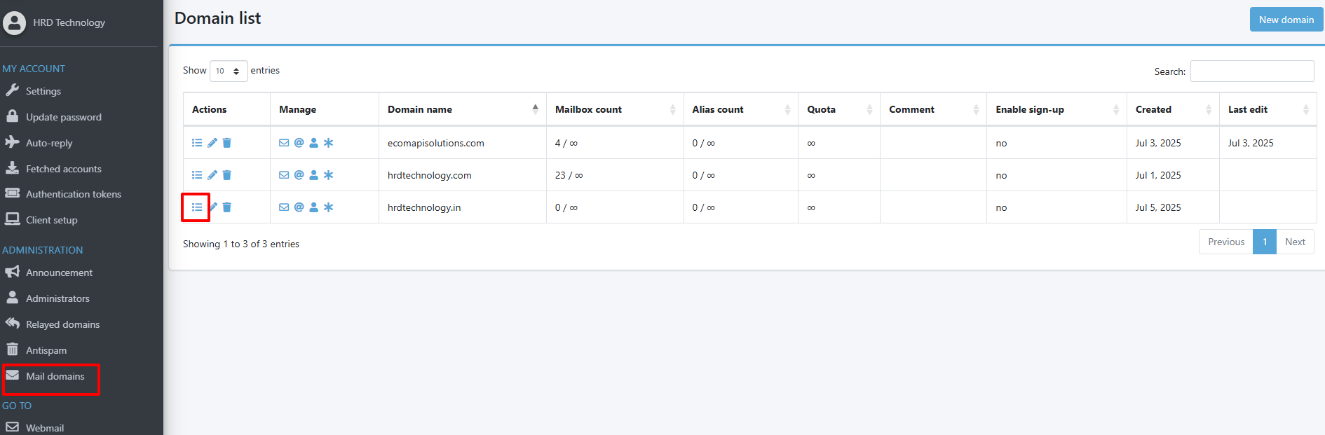 Once the domain is created. Mailu will display all the domain list select the domain list that you want to setup the dns